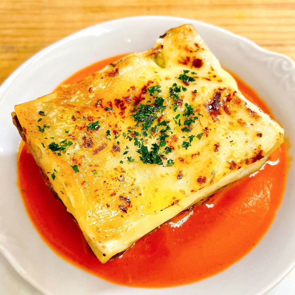 野菜だけでラグーソースをつくり、ラザニア、チーズと一緒に重ね焼きにしました。